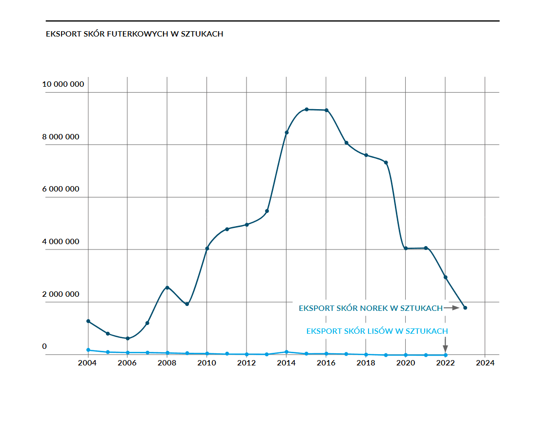 Wartość eksportu skór norek i lisów w latach 2004 - 2024, raport o stanie branży futrzarskiej w Polsce, 2024To, co się nie zmieniło to horror tysięcy zwierząt zamkniętych w ciasnych klatkach. Każdy kolejny rok bez zakazu to skazanie na śmierć kolejnych tysięcy zwierząt.