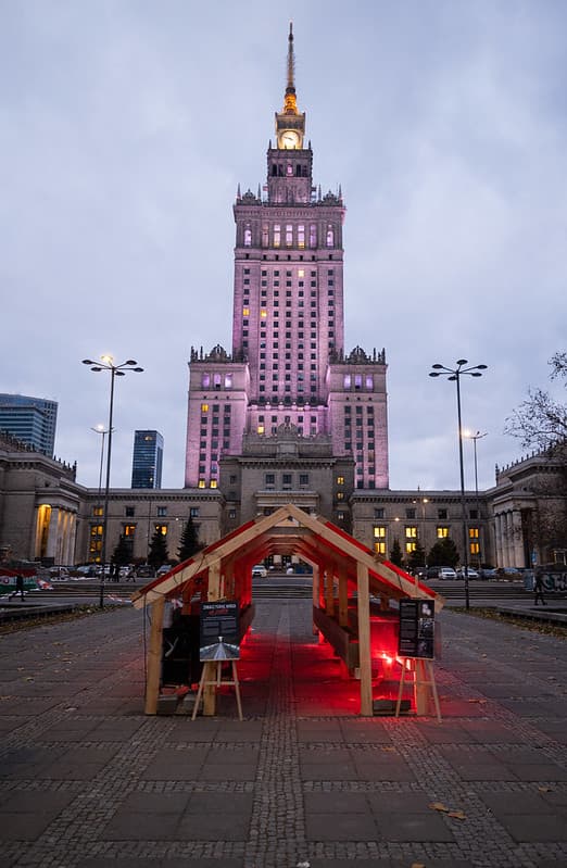 Ferma norek pod Pałacem Kultury i Nauki. Przechodnie mogli wejść do środka, zobaczyć klatki z prawdziwej fermy futrzarskiej, usłyszeć odgłosy zwierząt i zobaczyć replikę skrzyni do gazowania norek. Fot. Andrew SkowronDzień Bez Futra - przemarsz dla zwierząt