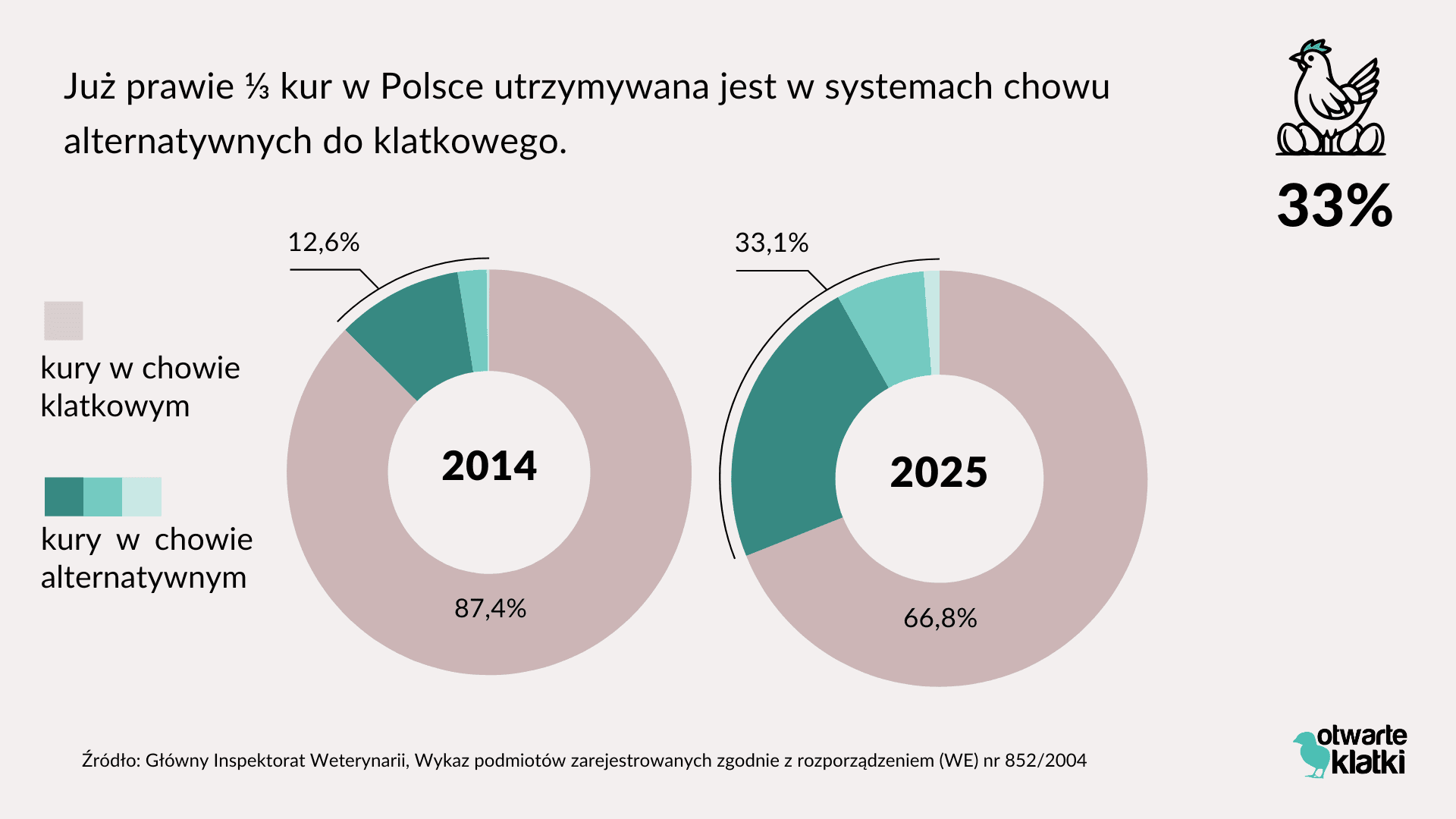 W ciągu ostatniego roku udział chowu klatkowego spadł o niemal 5 punktów procentowych. Choć może się wydawać, że to niewielka zmiana, w kontekście skali produkcji oznacza to, że kilka milionów kur niosek uniknęło życia w klatkach.